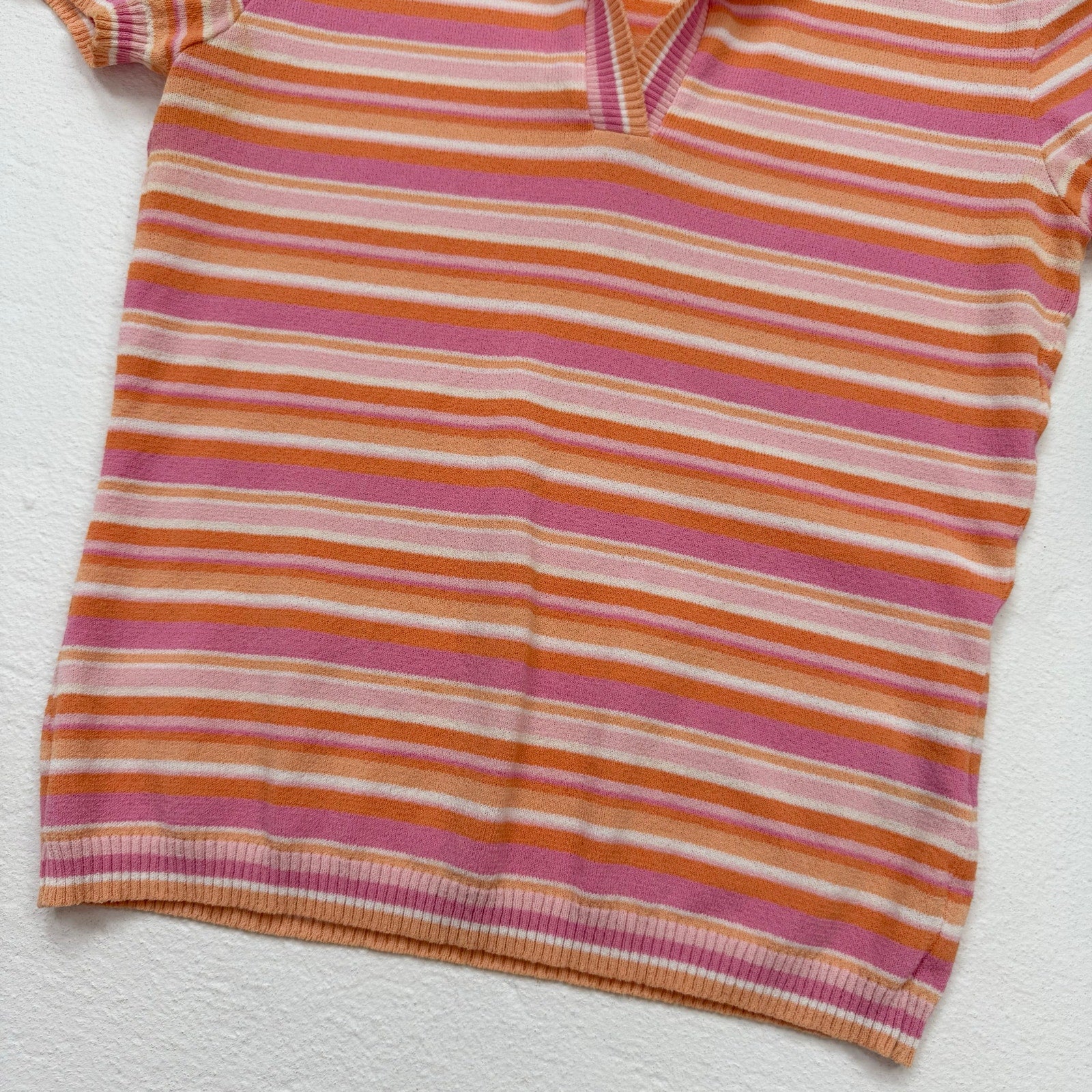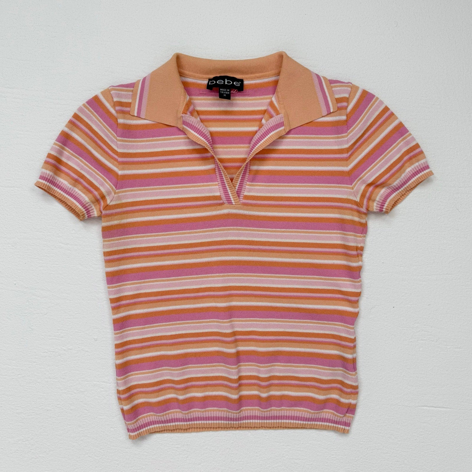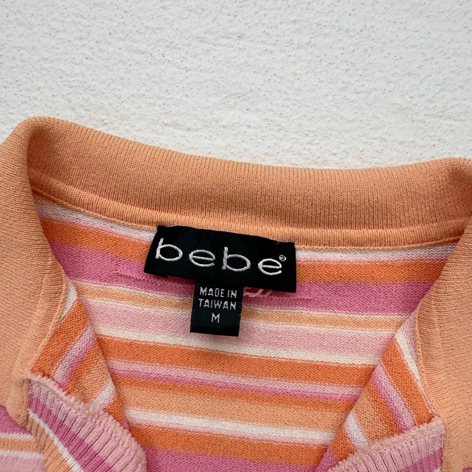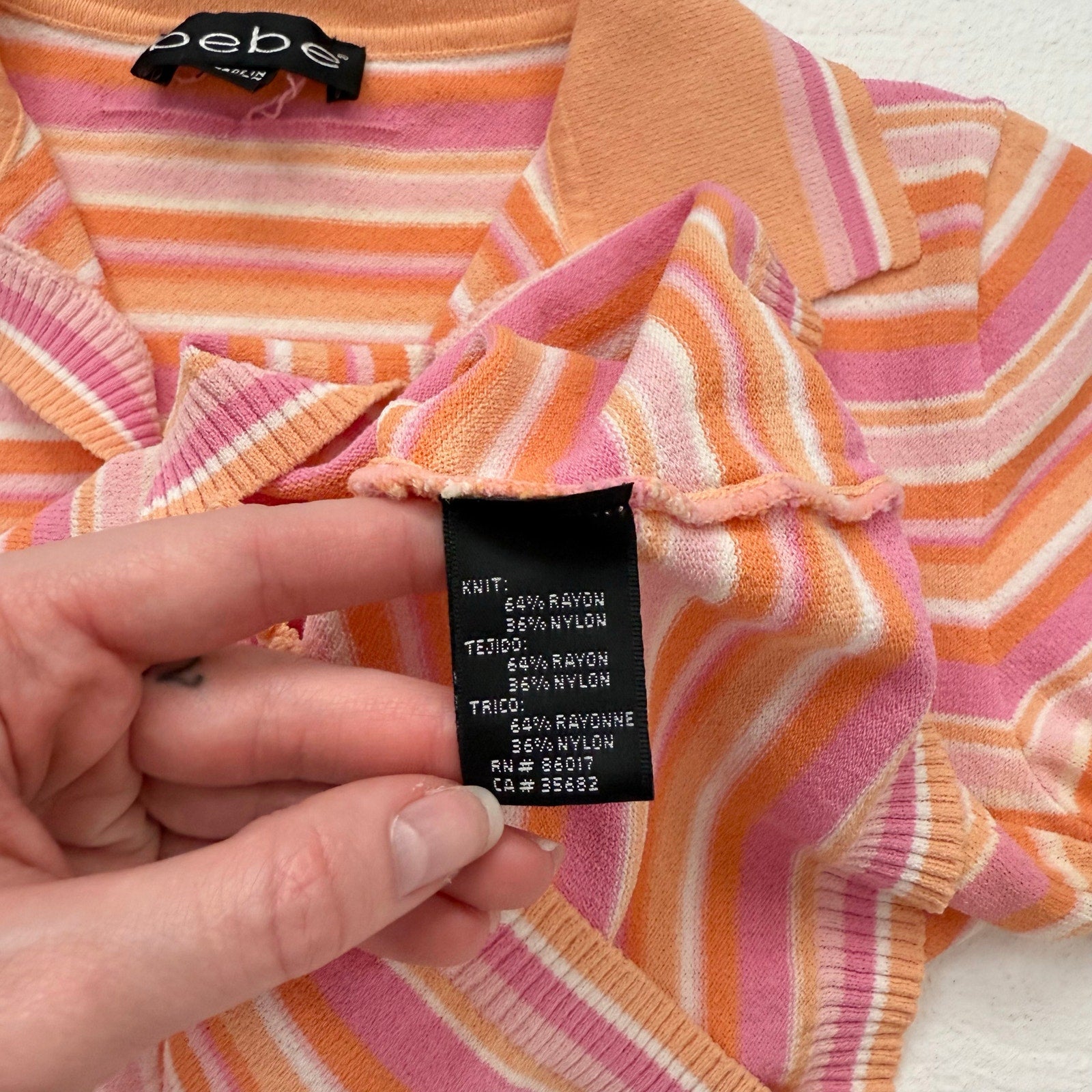 Y2K Bebe Pink Orange Ribbed Stripe Polo Top, Size Medium