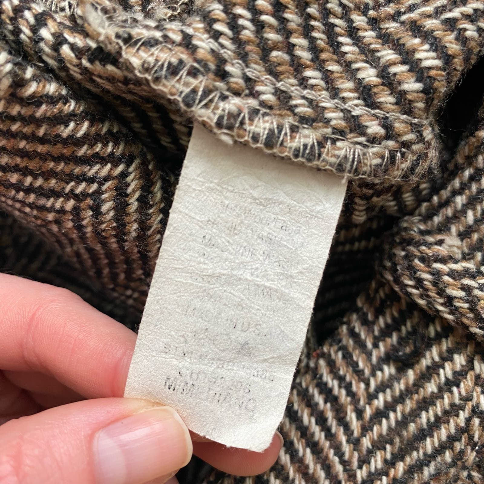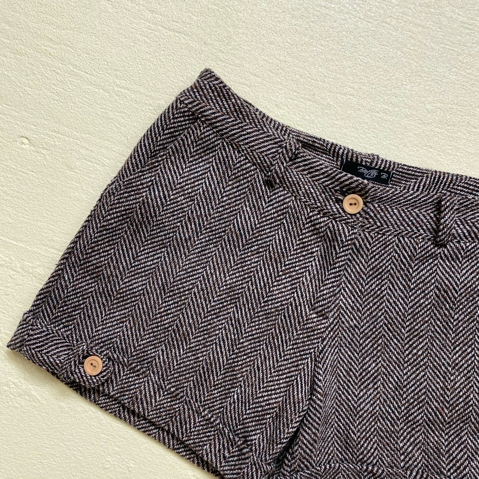vintage mid rise cuffed wool blend shorts. open front pockets. button cuff detail. belt loops. front zip top button fly closure. 30" waist