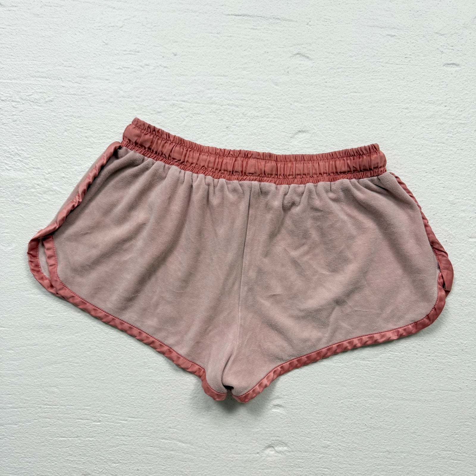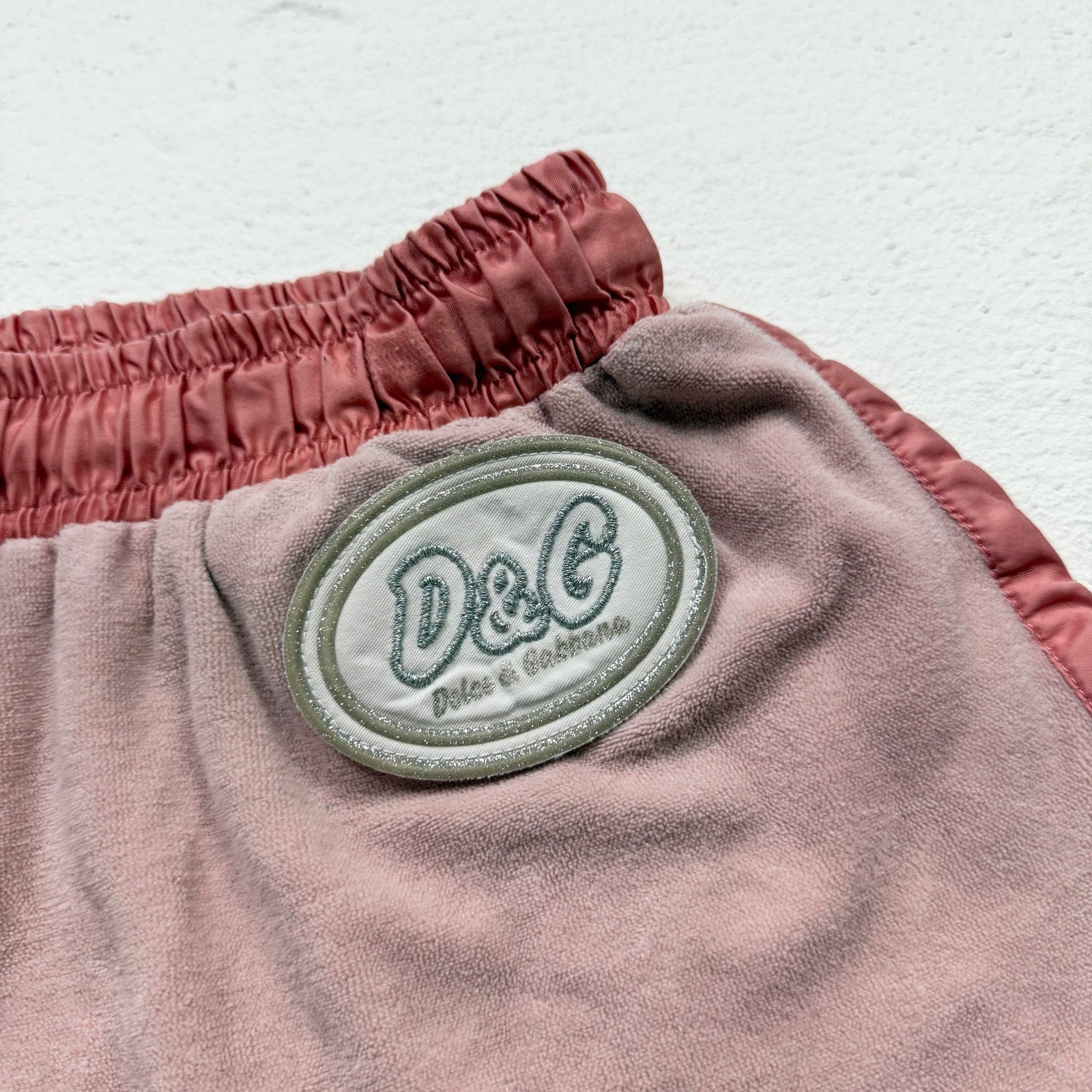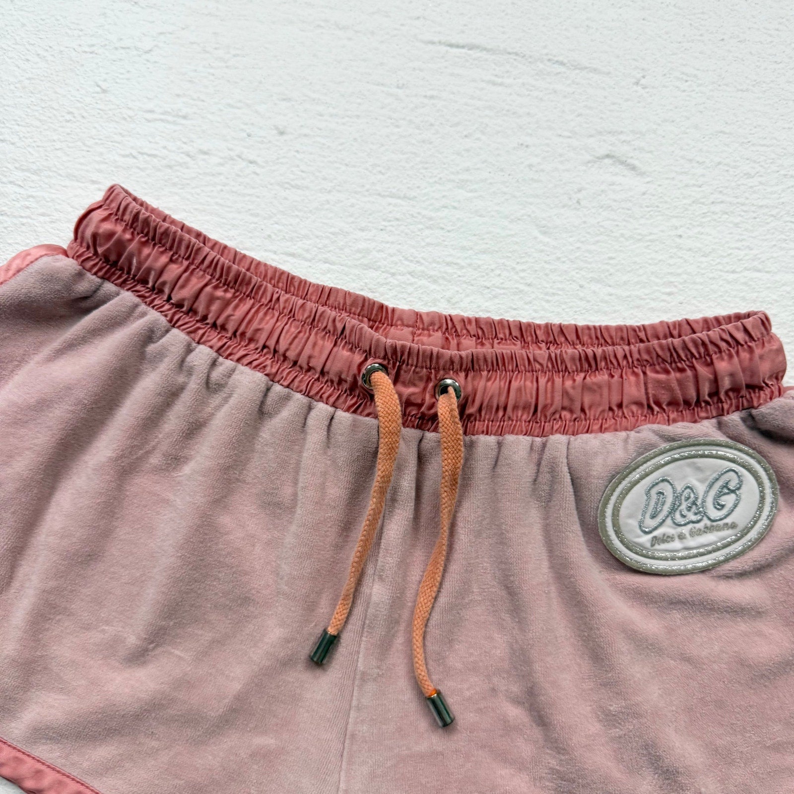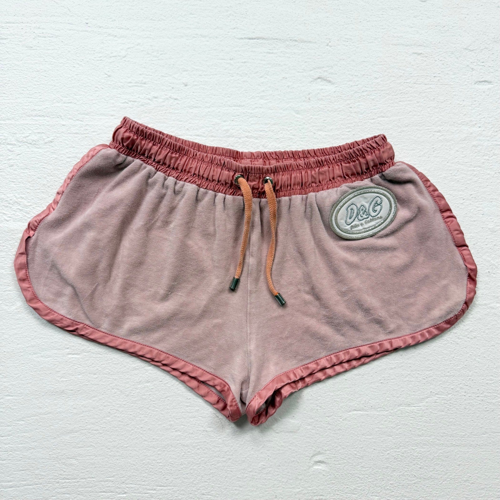 authentic early 2000s dolce & gabbana shorts in soft peach velour with glossy satin trim and sparkly metallic d&g patch detail. features a high rise fit with short inseam and elastic drawstring waistband — the perfect vintage y2k designer lounge or streetwear piece.