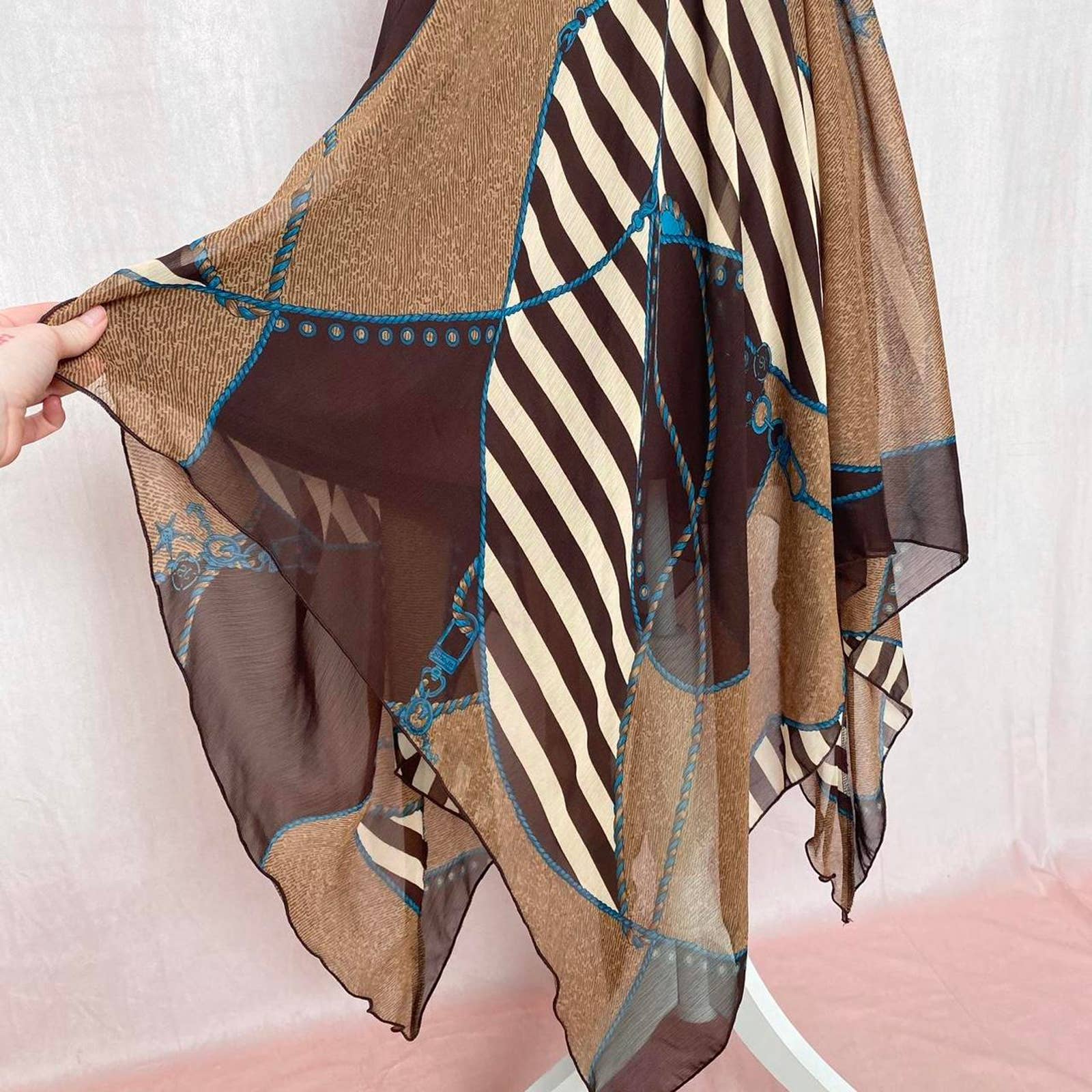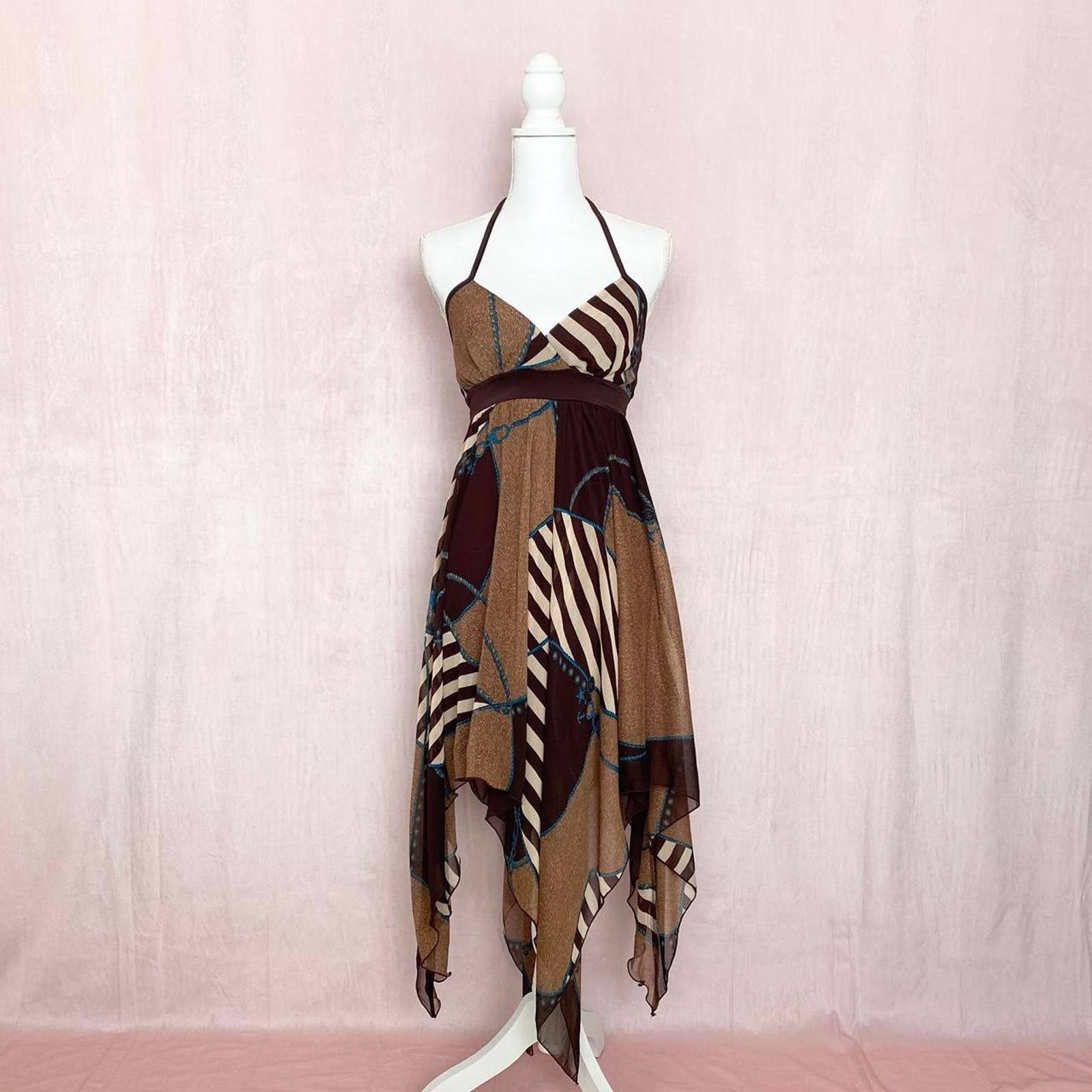 vintage famosa usa handkerchief hem whimsigoth halter dress with multicolor stripe anchor rope pattern. v-neck. fit & flare. flowy sheer shell with inside lining. mini-midi length. adjustable halter tie