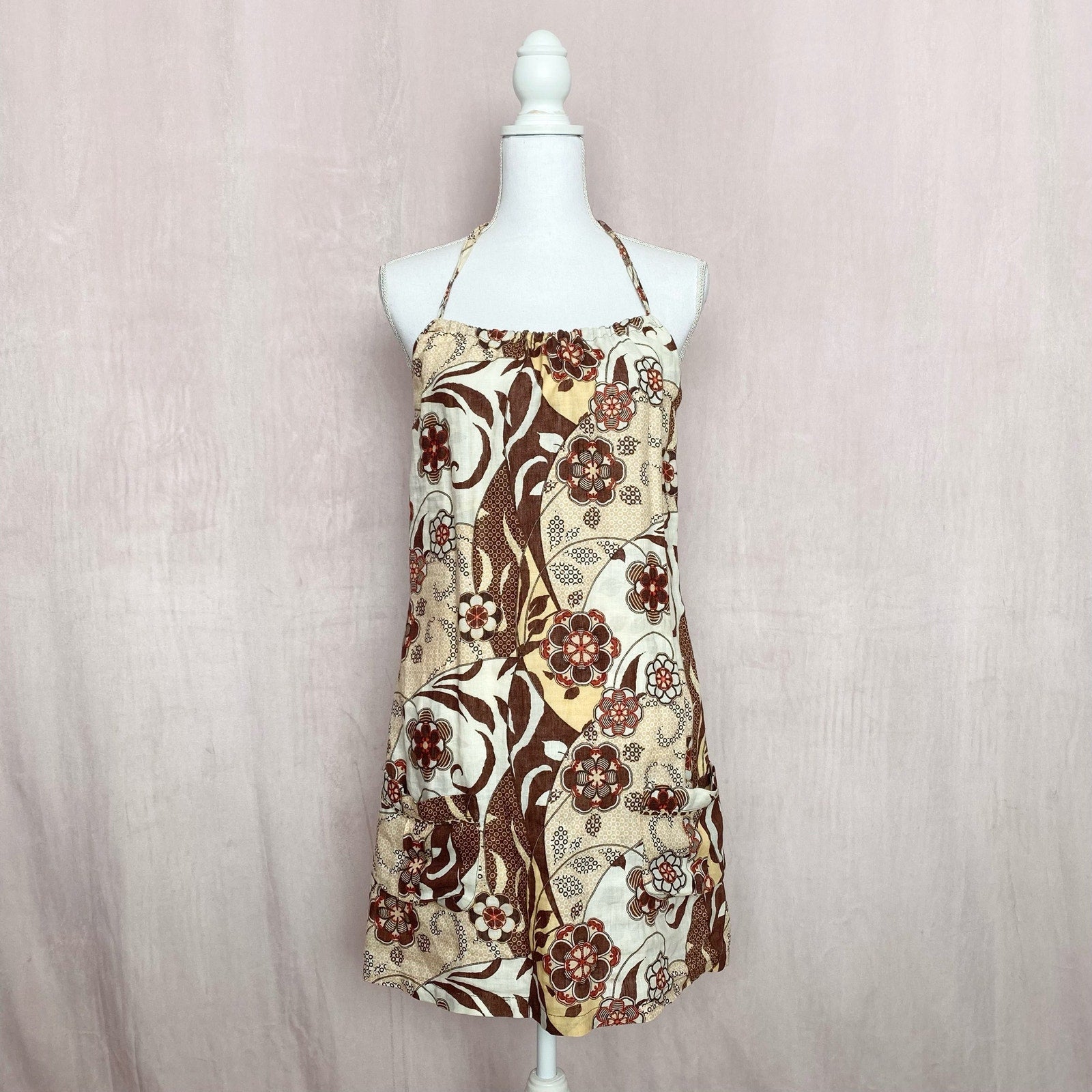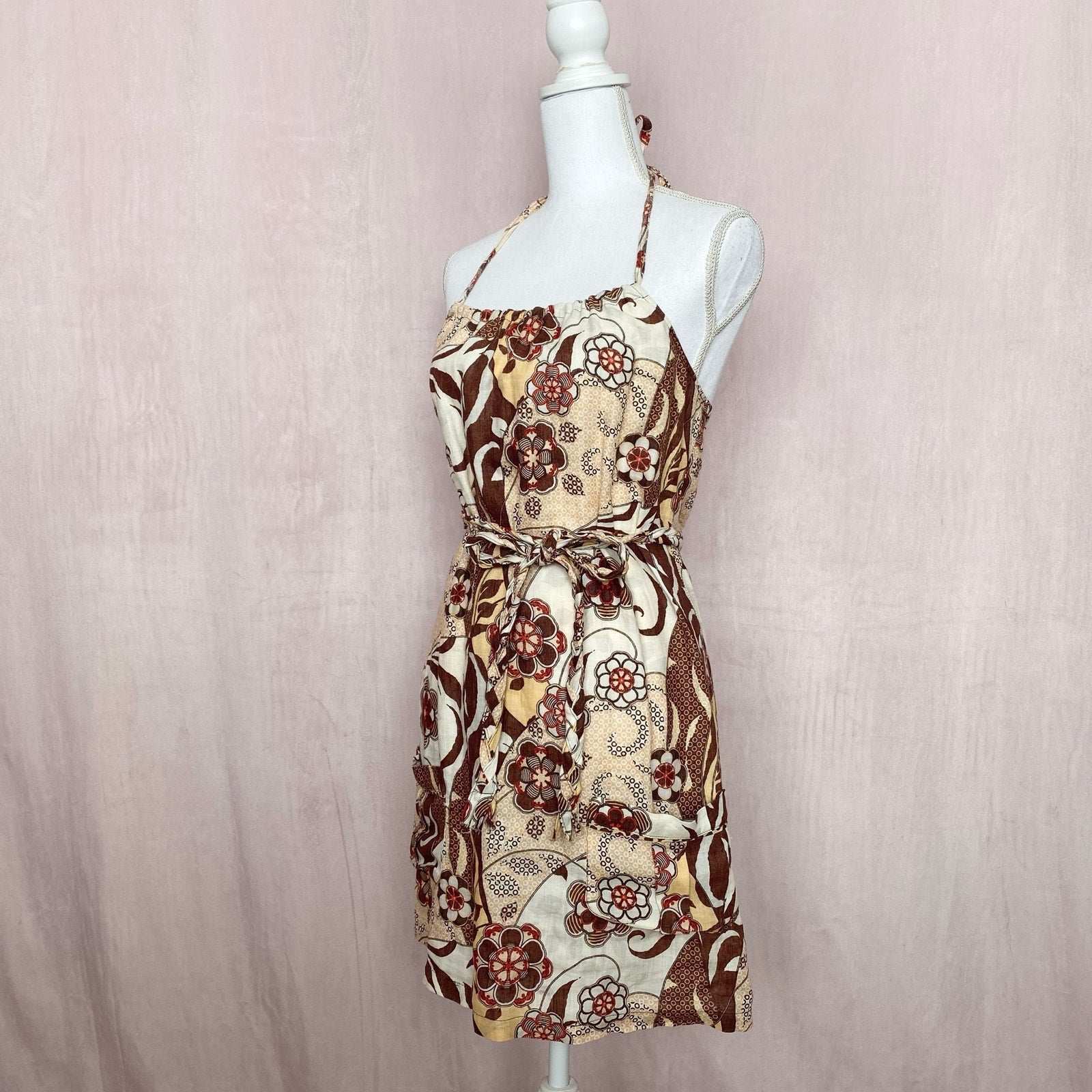 vintage 2000s boho hippie flaxseed drawstring halter mini A-line dress with braided tie belt detail. tie halter strap. lightweight woven fabric, very lightly see through