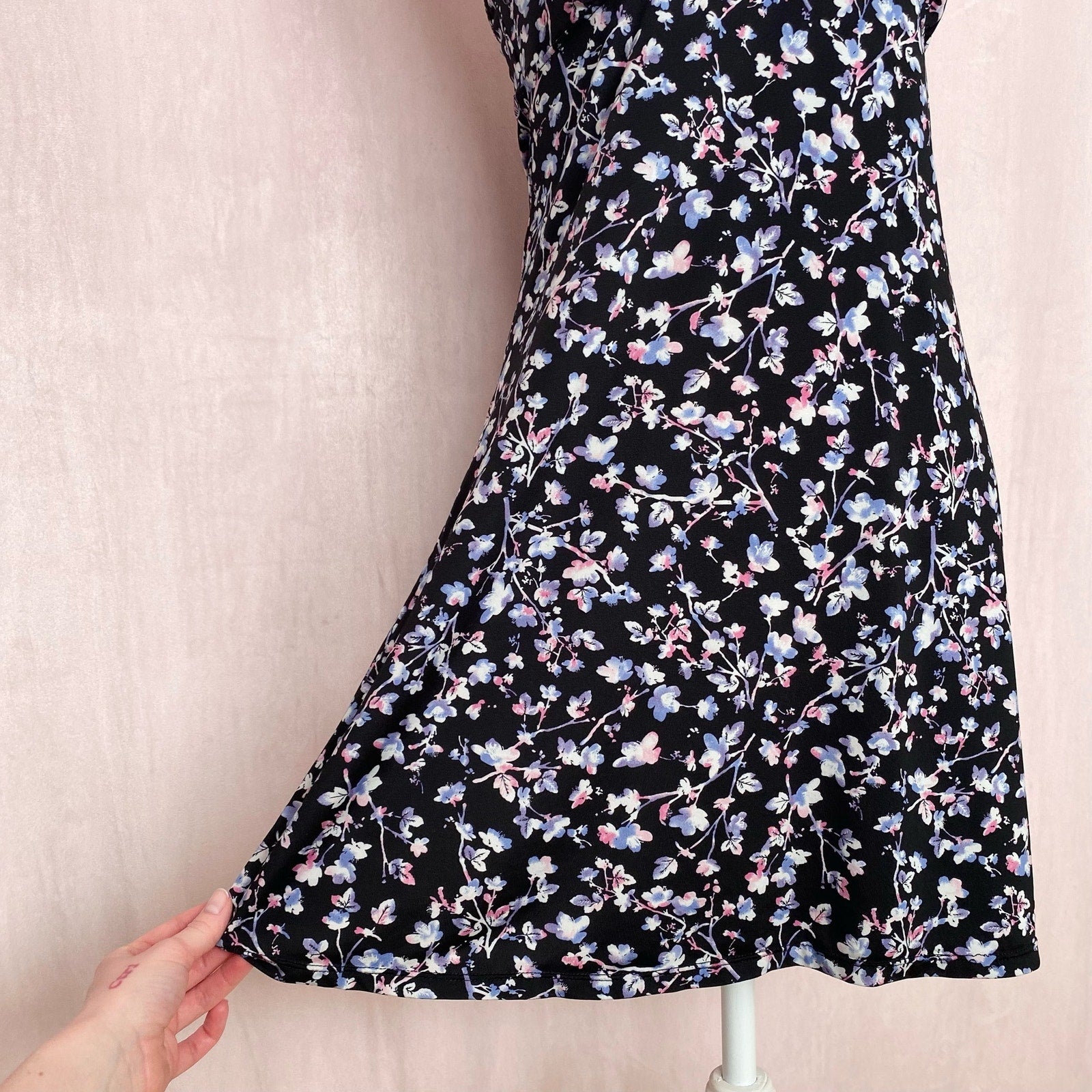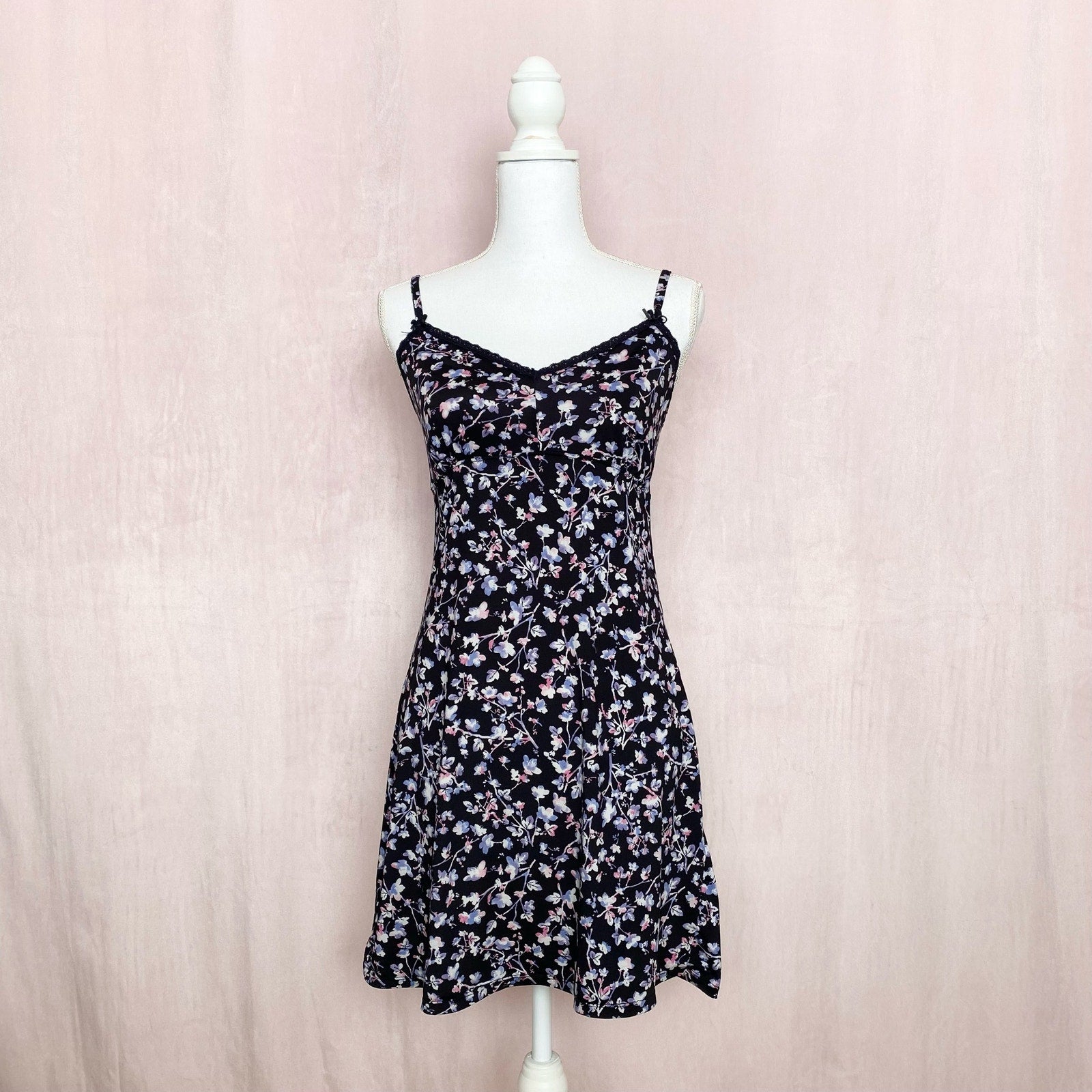 vintage 2000s floral print black fit & flare mini chemise stretch dress with lace trim bow detail neckline. adjustable spaghetti straps. super stretchy thin lightweight fabric - lightly see through! no size - would say this fits medium best! please see measurements