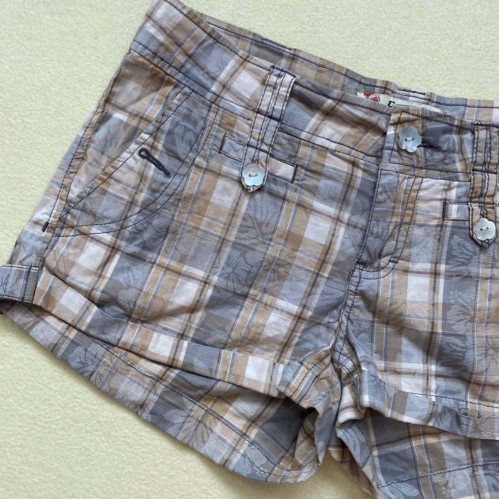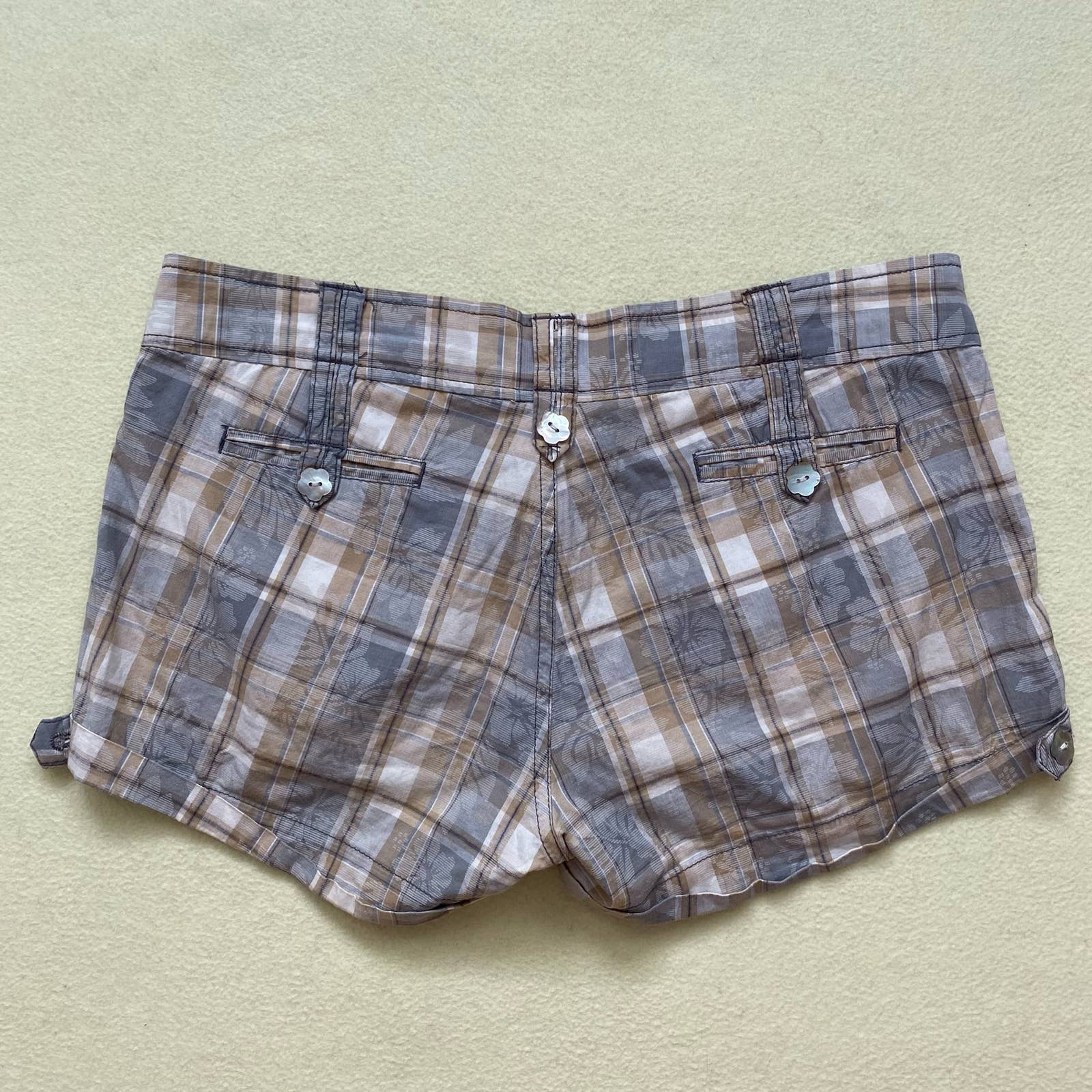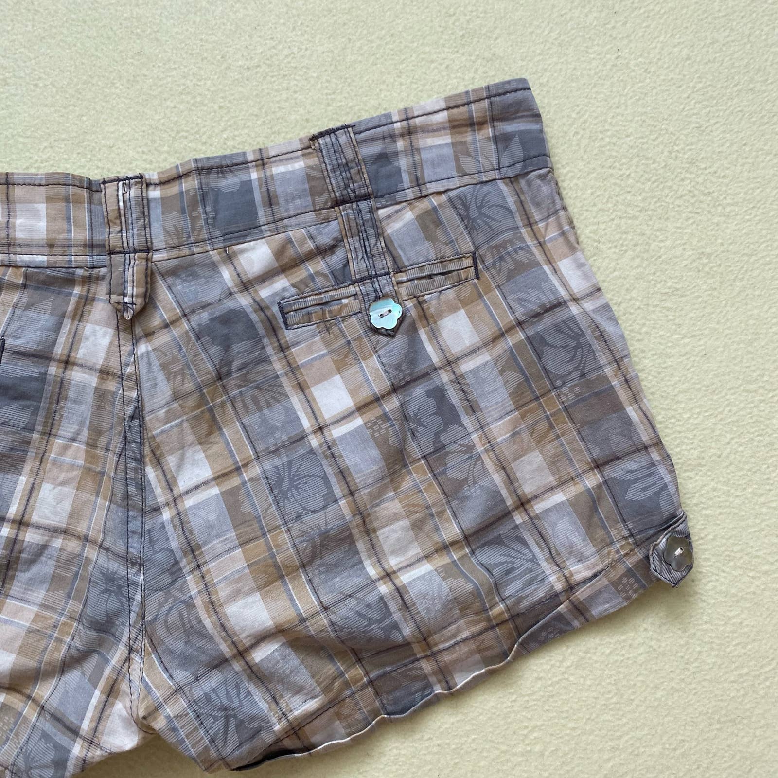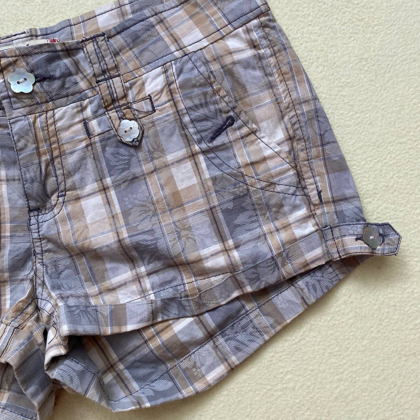 low rise plaid floral print cuffed short shorts. opal flower button detail. open pockets on front & button closure back pockets. belt loops. zipper button closure