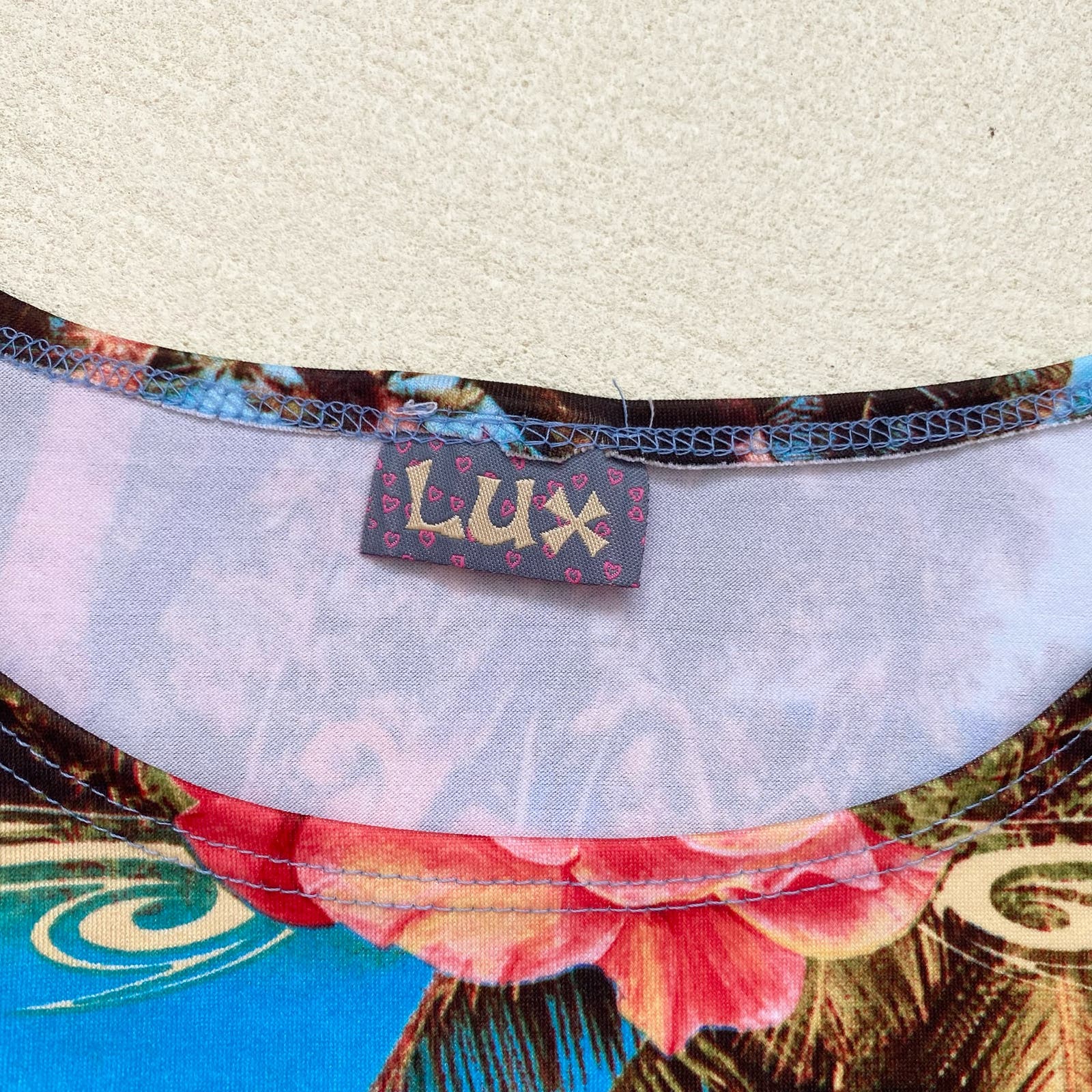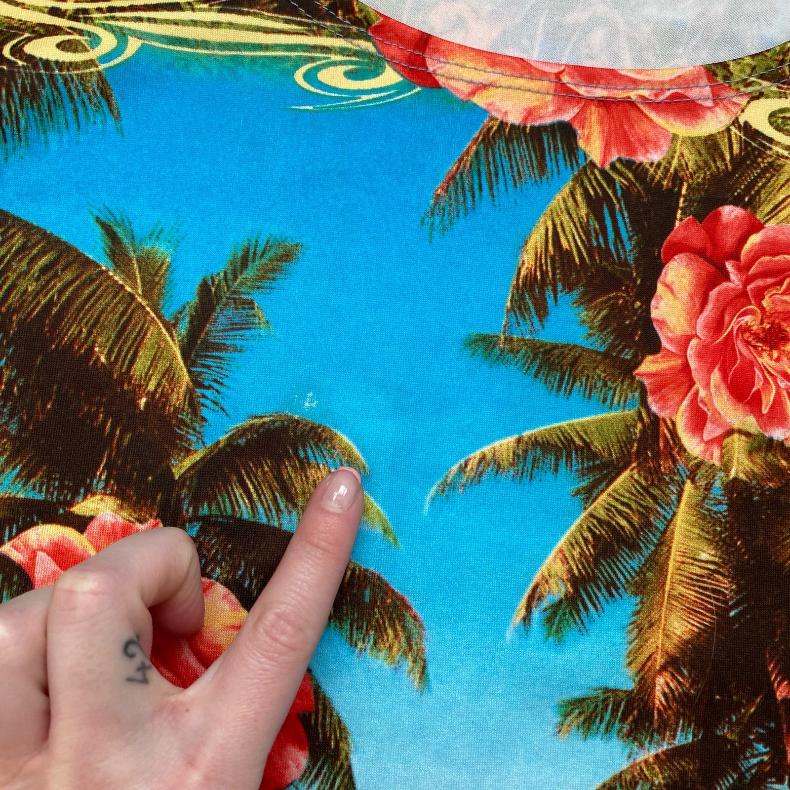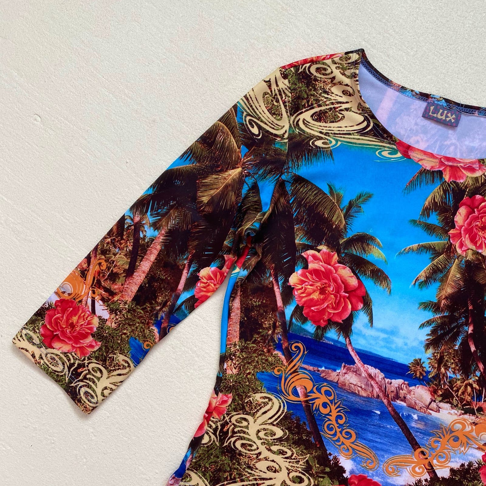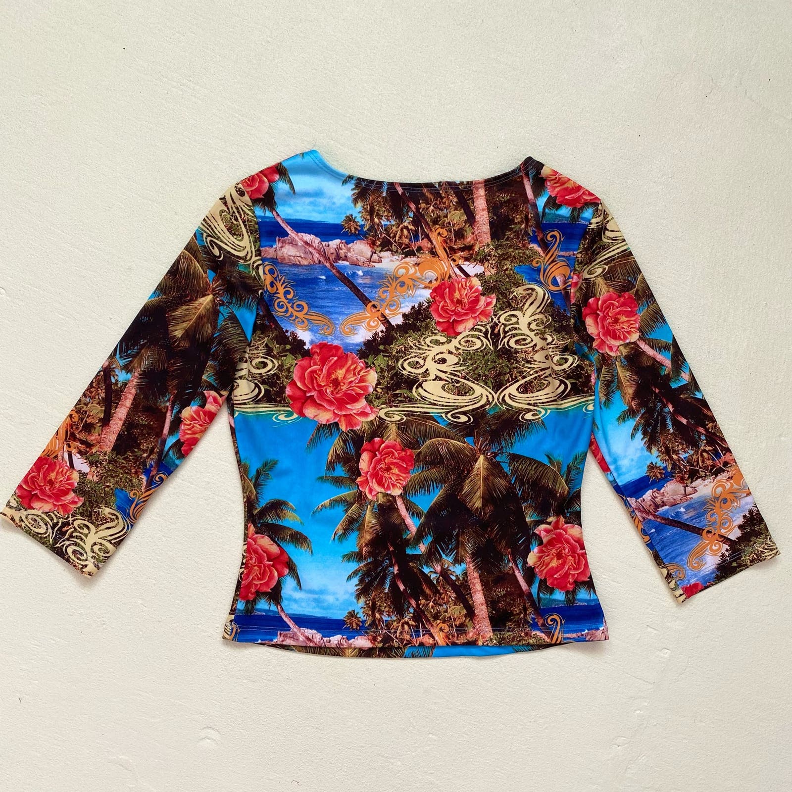 vintage / y2k tropical beach island all over print 3/4 sleeve stretchy fitted top. no size tag, fits women’s medium-large - please see measurements! made of super stretchy lightweight fabric