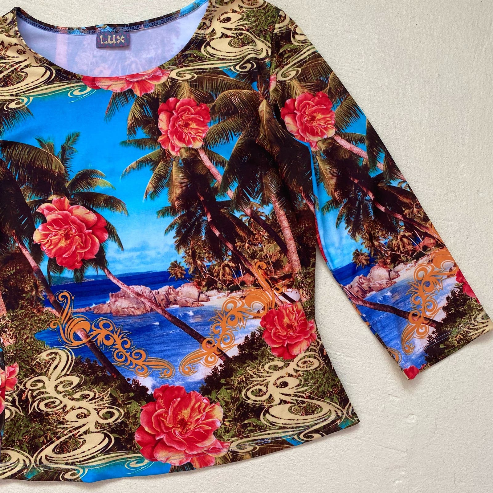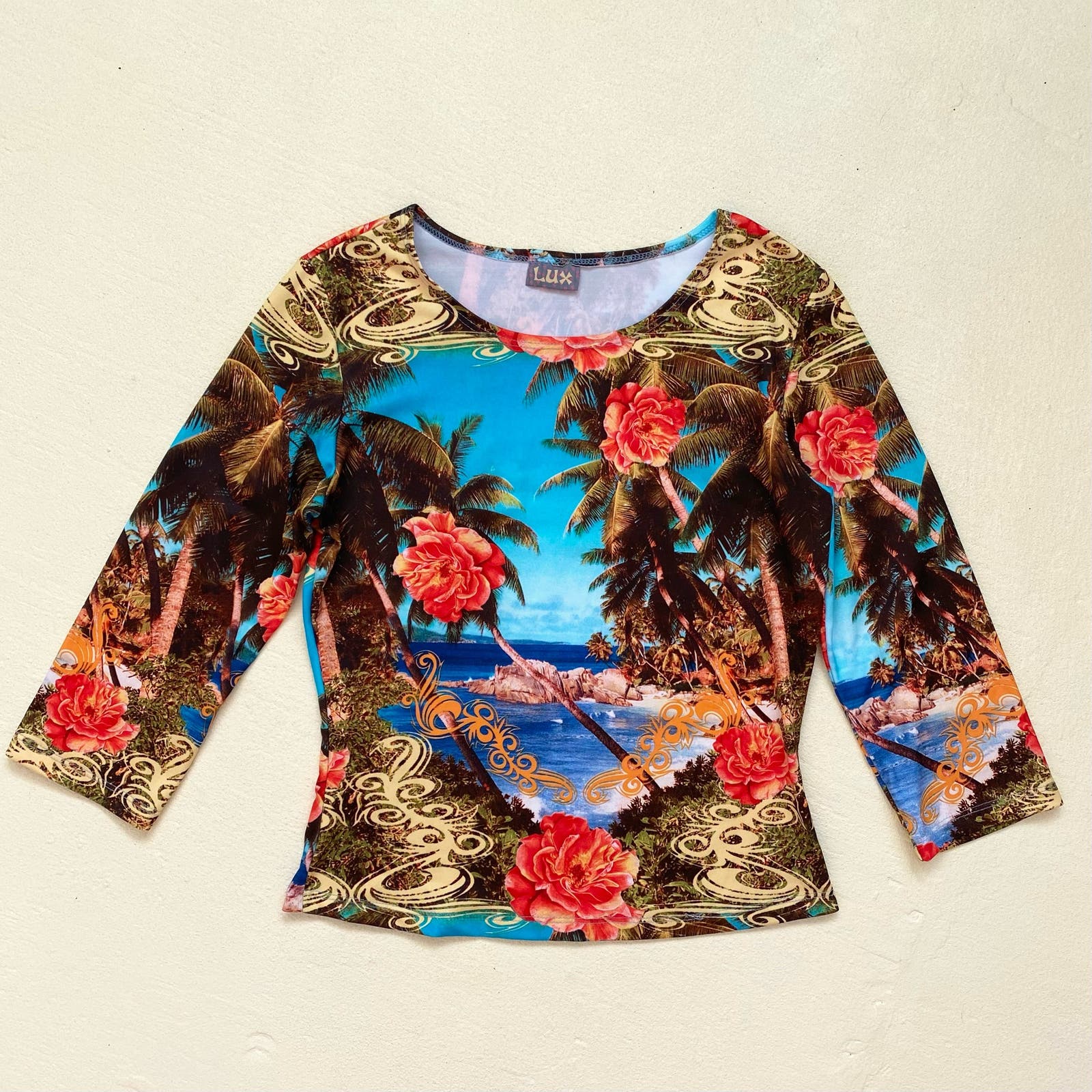 Y2K Lux Tropical Beach Allover Print 3/4 Sleeve Top, Size Medium