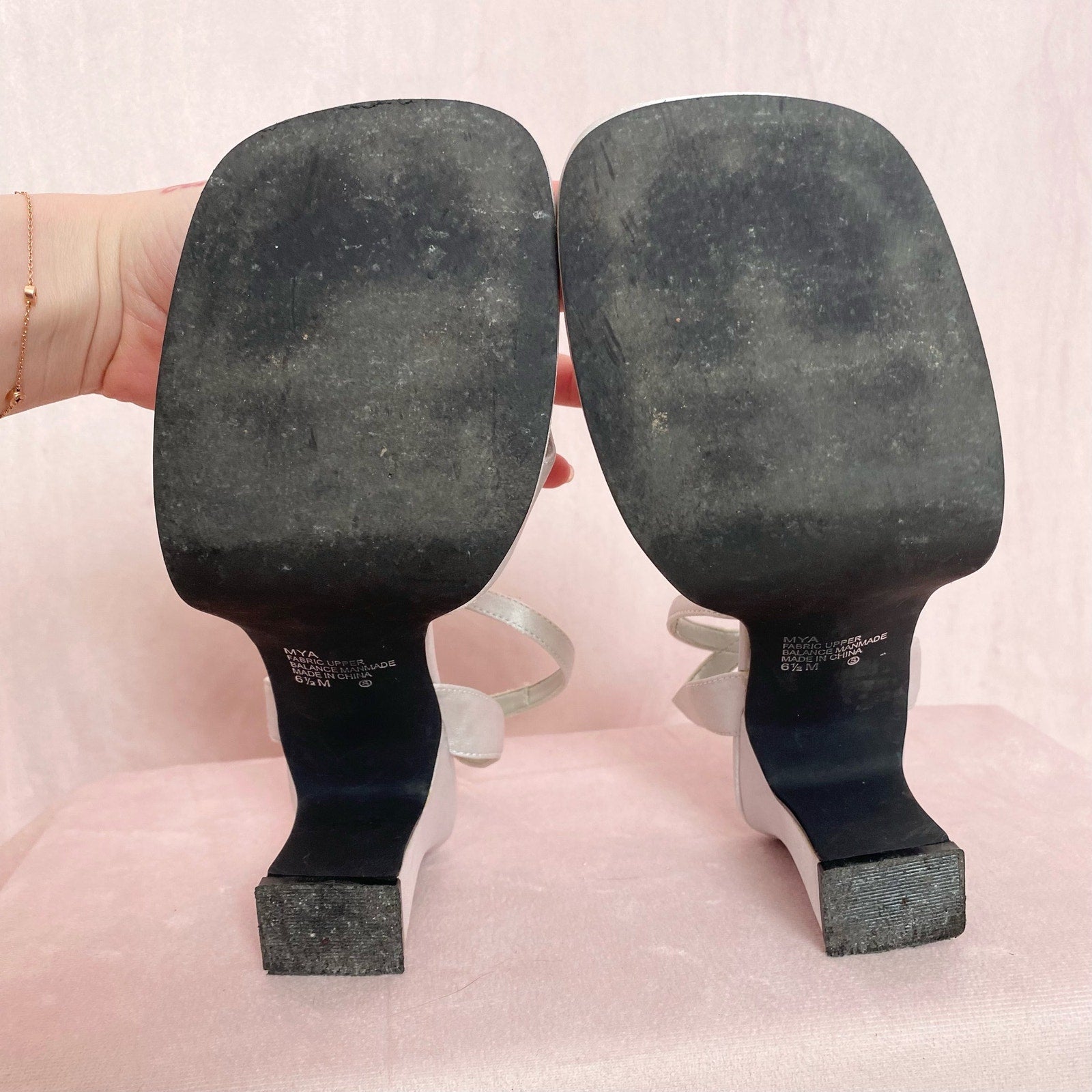 vintage Y2K Mudd chunky crisscross strappy open toe heeled sandals with 3” block heel. fabric upper. adjustable ankle buckle