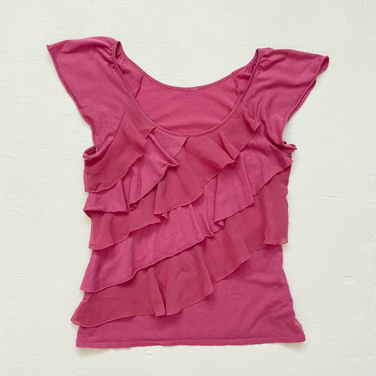 flowy cap sleeve tiered ruffle scoop neck short sleeve top. soft stretchy lightweight cotton fabric. no marked size - please see measurements!