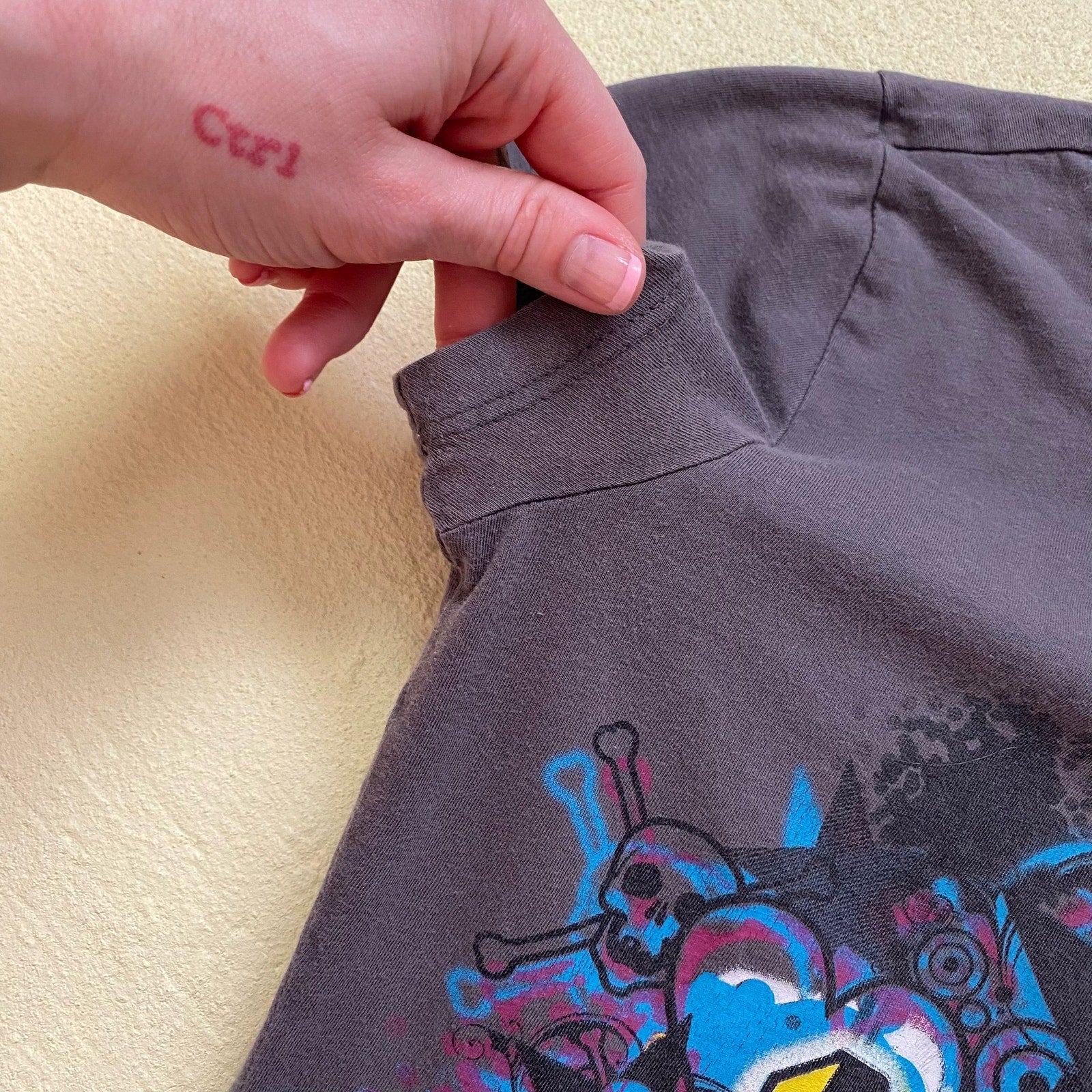 love graffiti skull crossbones heart star graphic print fitted baby tee t-shirt. soft stretchy lightweight cotton fabric