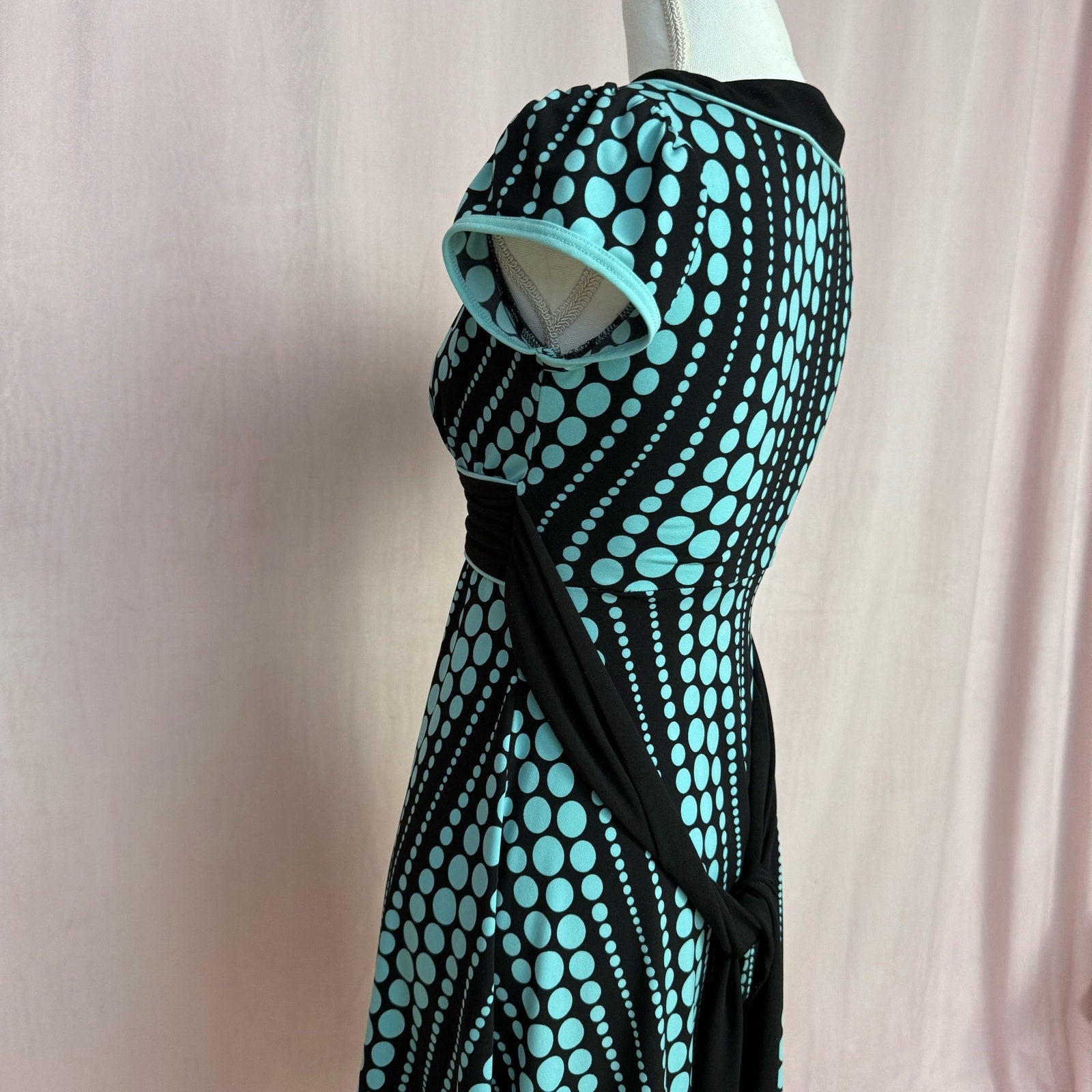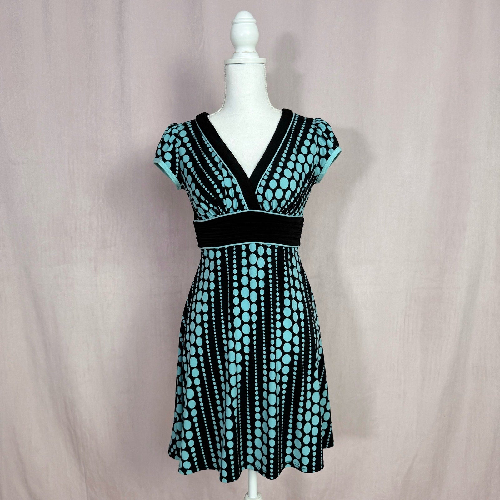 y2k vintage fit & flare short sleeve polka dot stretch flowy mini dress with back tie. made of thin lightweight stretch fabric