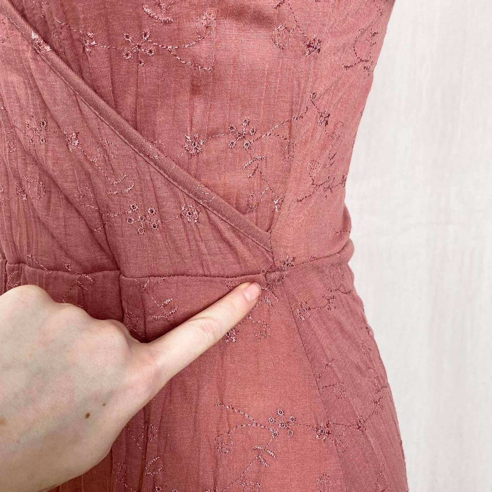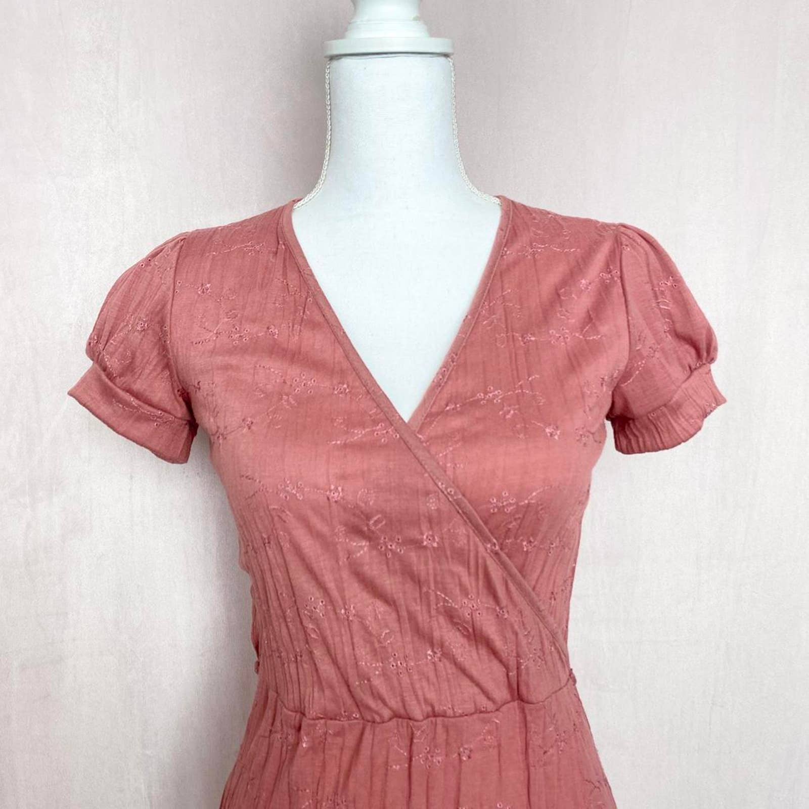 short sleeve faux wrap v-neck fit & flare boho midi cottage dress with embroidery throughout. pleated / crinkled soft lightweight fabric, lightly see through