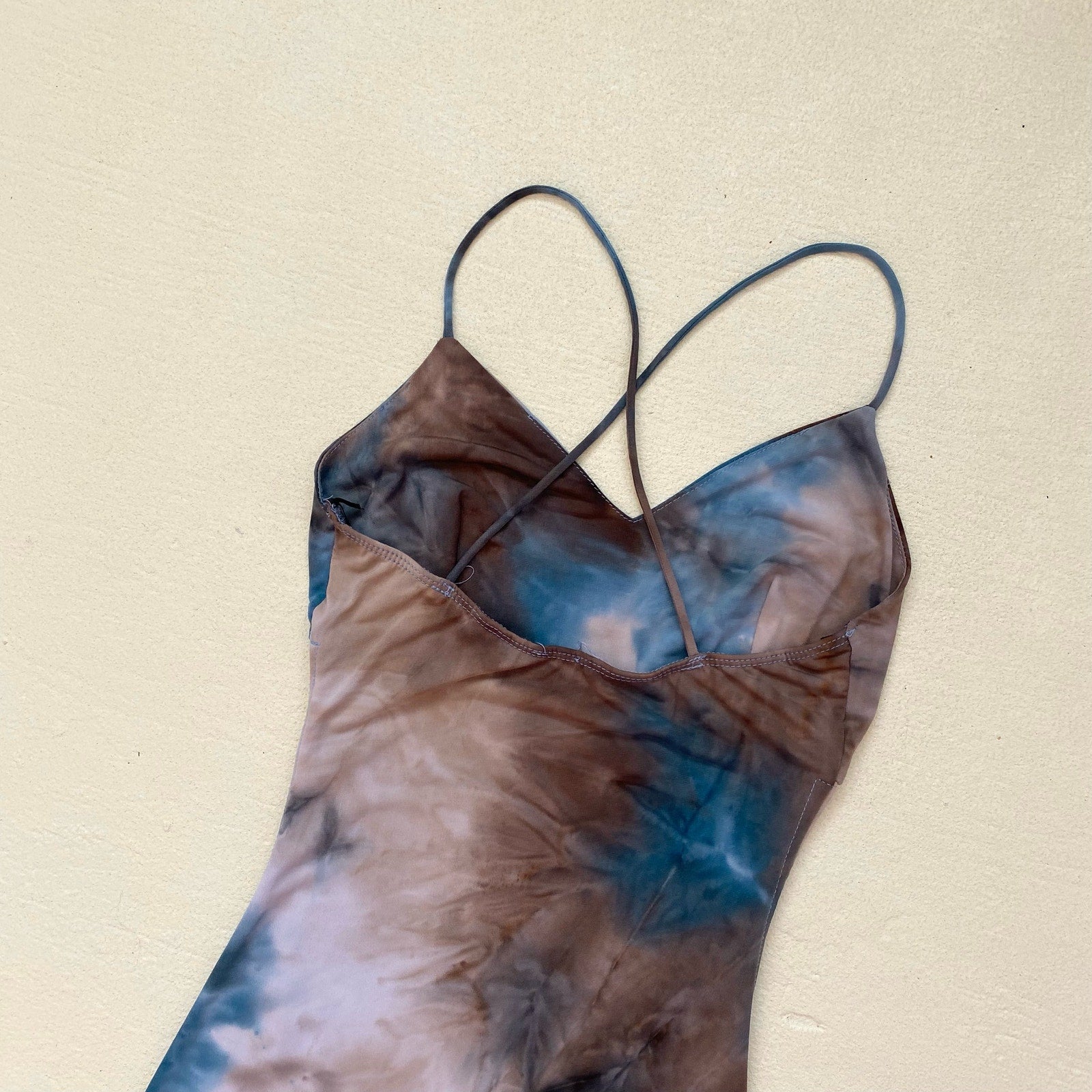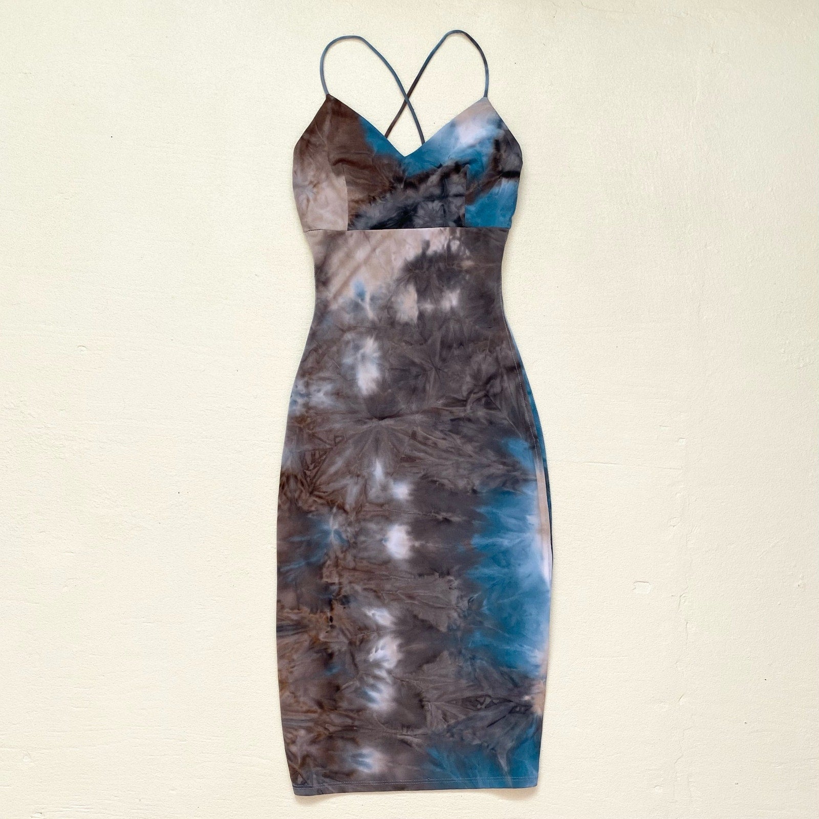 vintage 2000s boho hippie casual tie dyed v-neck bodycon cami midi dress with crisscross back. spaghetti straps