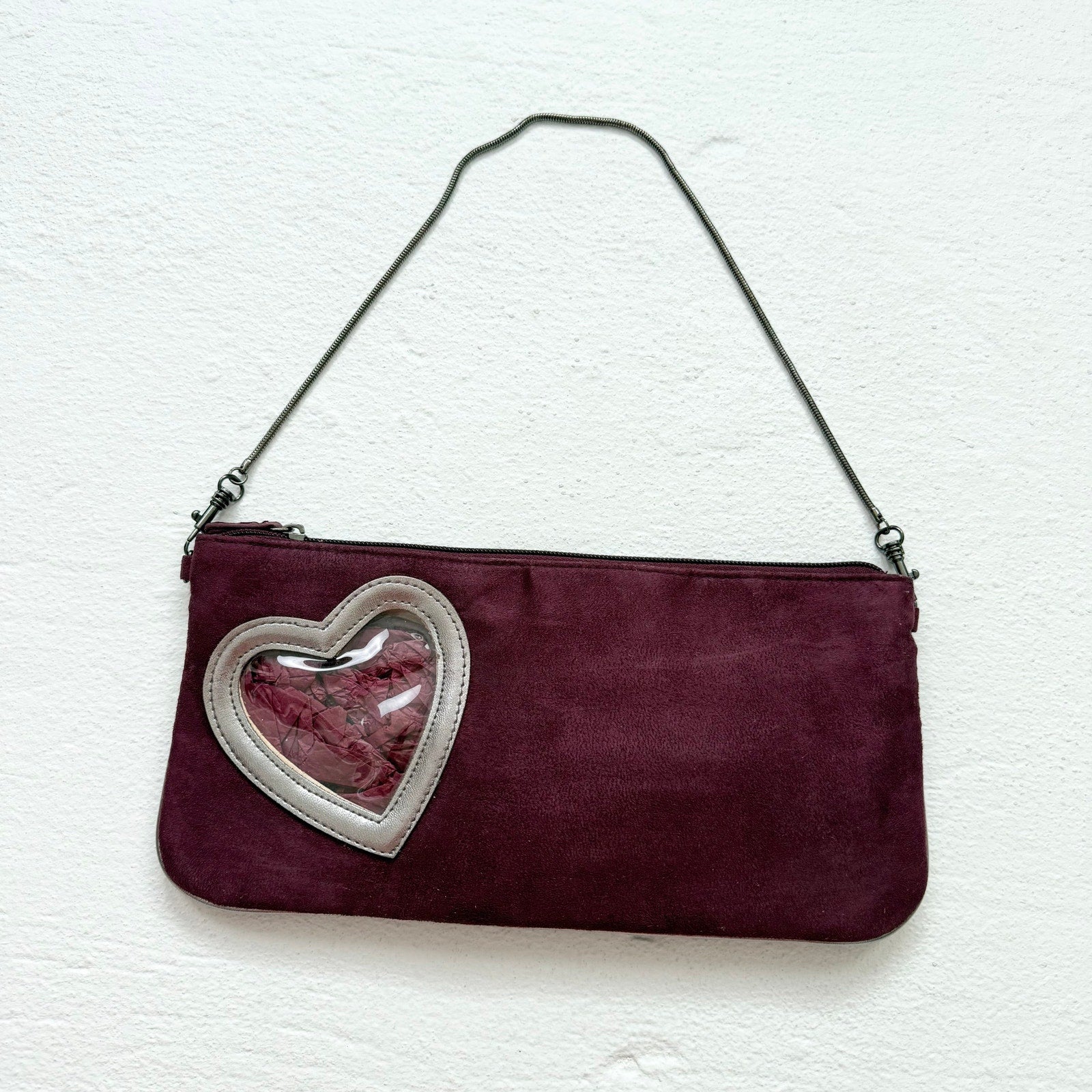 vintage early 2000s victoria’s secret clutch bag in soft plum purple suede with silver heart-shaped cutout and clear window. includes detachable metal chain strap to wear as a mini shoulder bag or wristlet. the perfect y2k accessory for going out, gifting, or display.