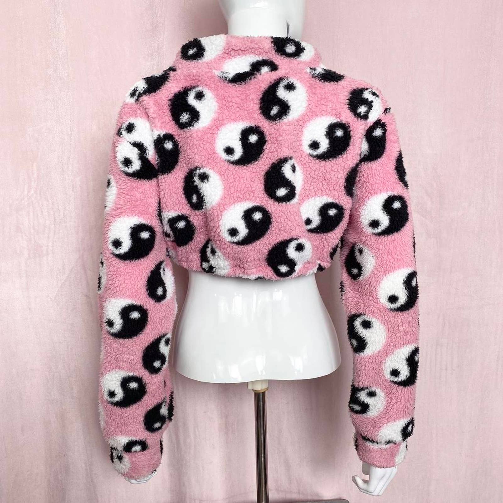 End Of Story pink long sleeve cropped teddy fleece sweater sweatshirt jacket with adjustable elastic cinch drawstring waistband & half zip. soft fluffy faux fur. black & white yin yang print. marked size large, fits small-large